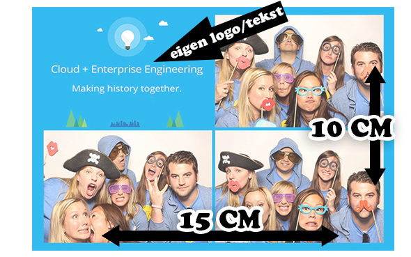 Je kan zelf de tekst bepalen die onder de foto’s wordt afgedrukt. Hierbij kan ook een logo komen te staan (vooraf indienen). Je kan kiezen uit 3 of 4 foto’s met je eigen tekst of logo.